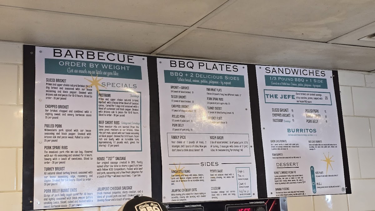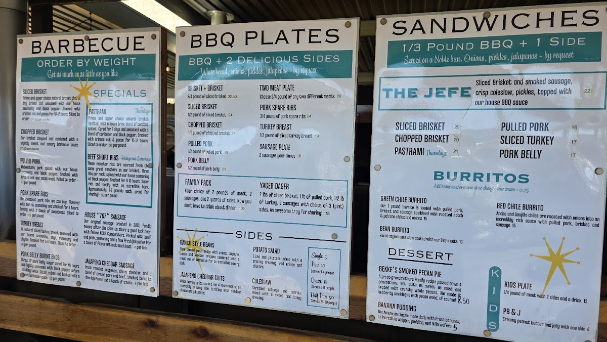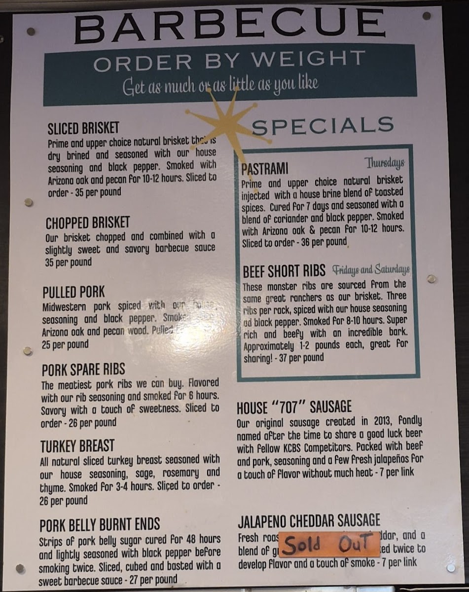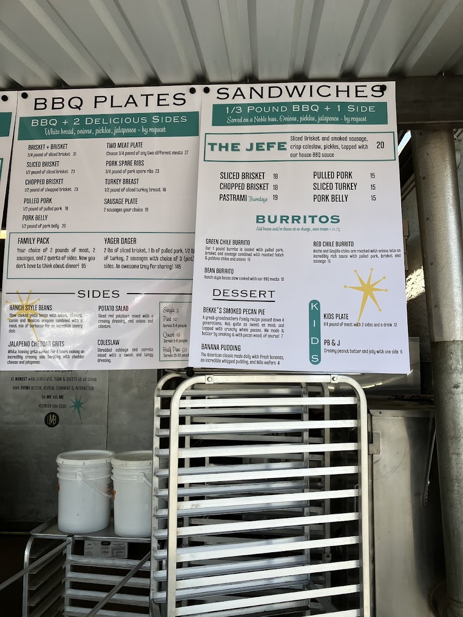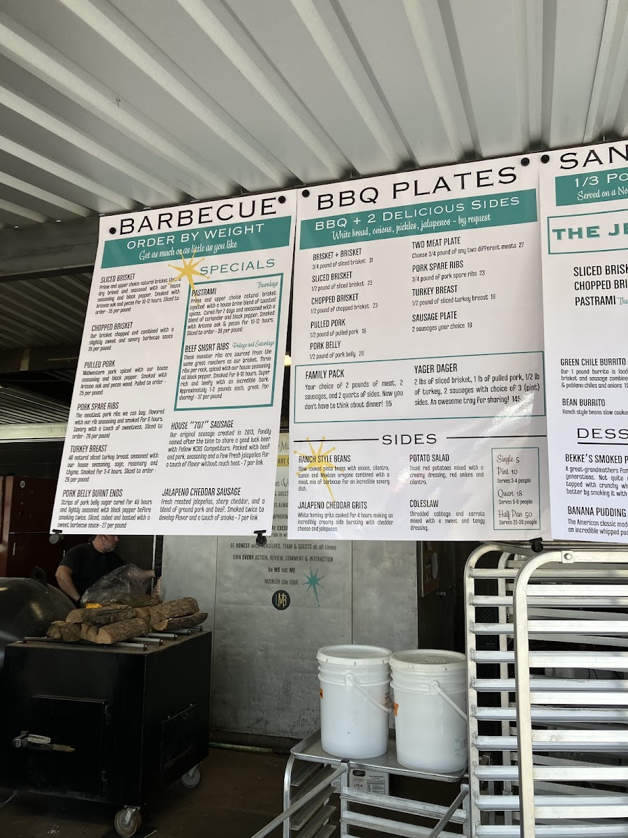 Serves 5-8. 2 lbs of brisket, 1 lb of pulled pork, 1/2 lb of turkey, 2 sausages with choice of 3 (pint) sides and OPJ.
