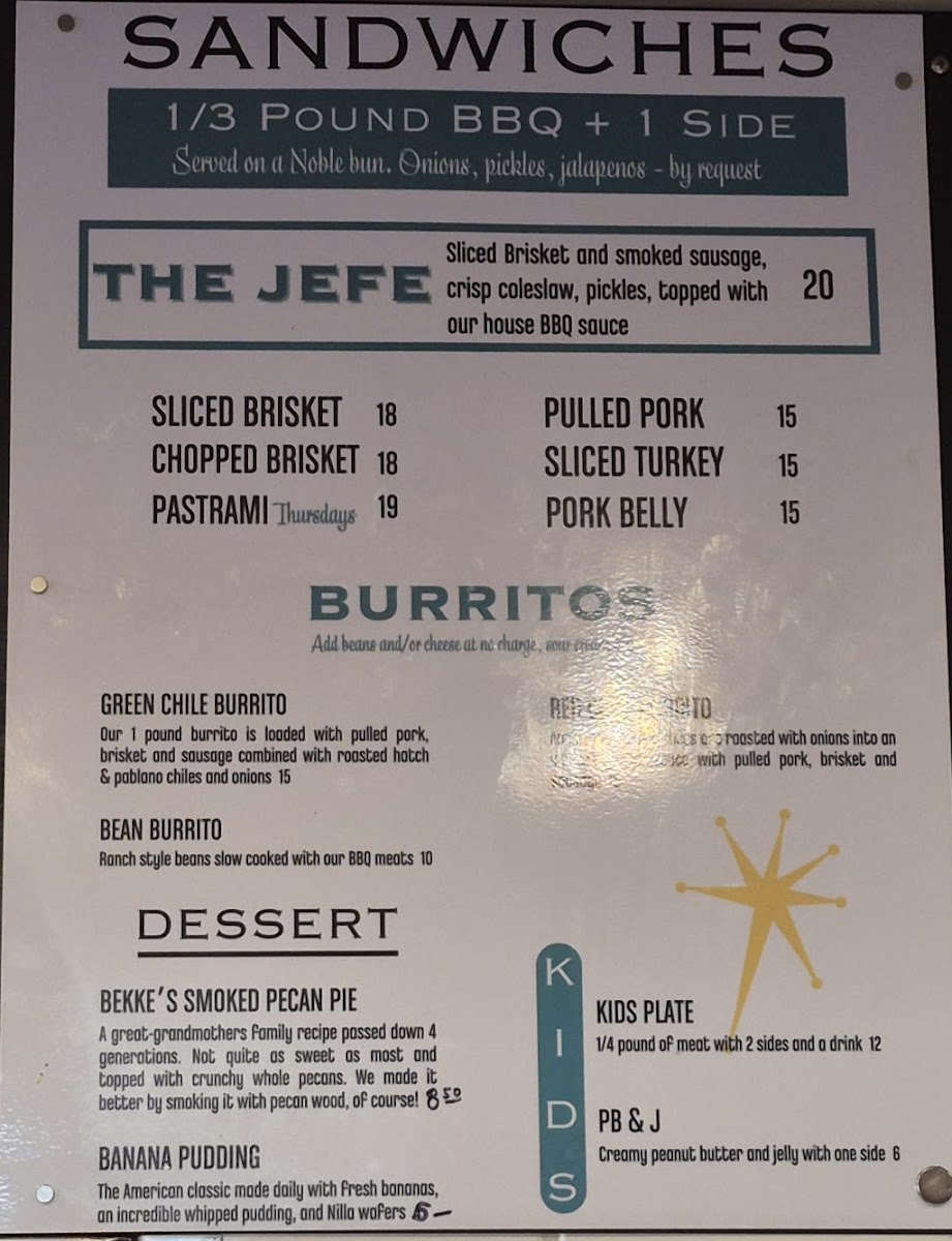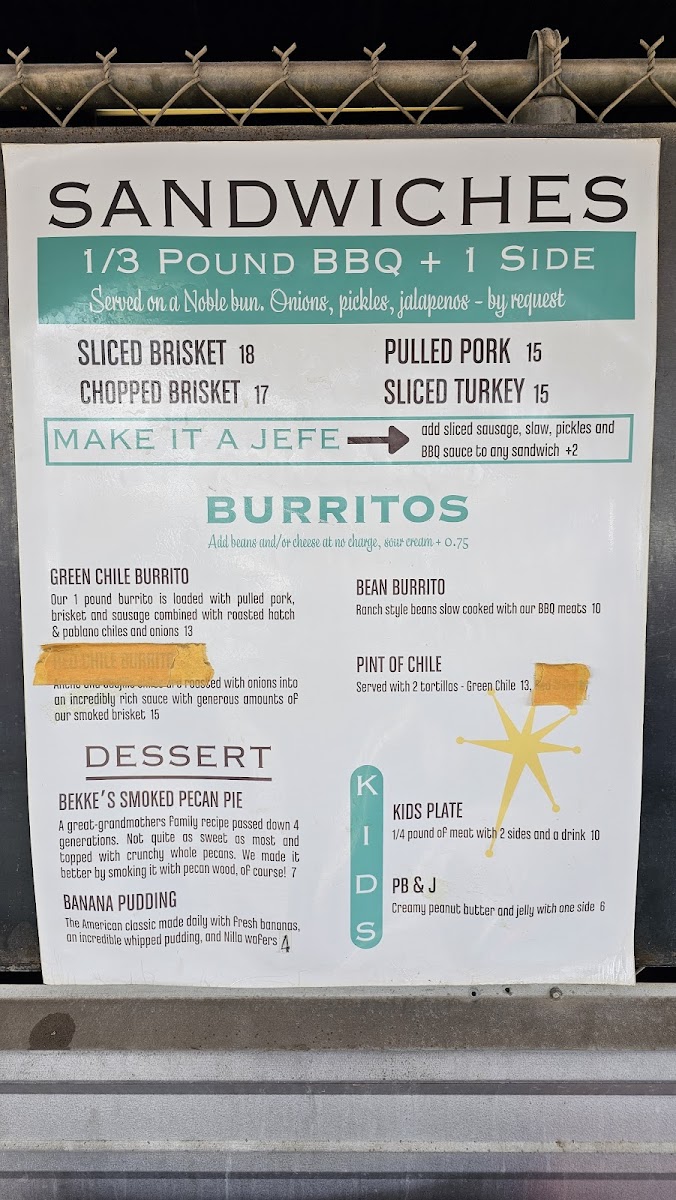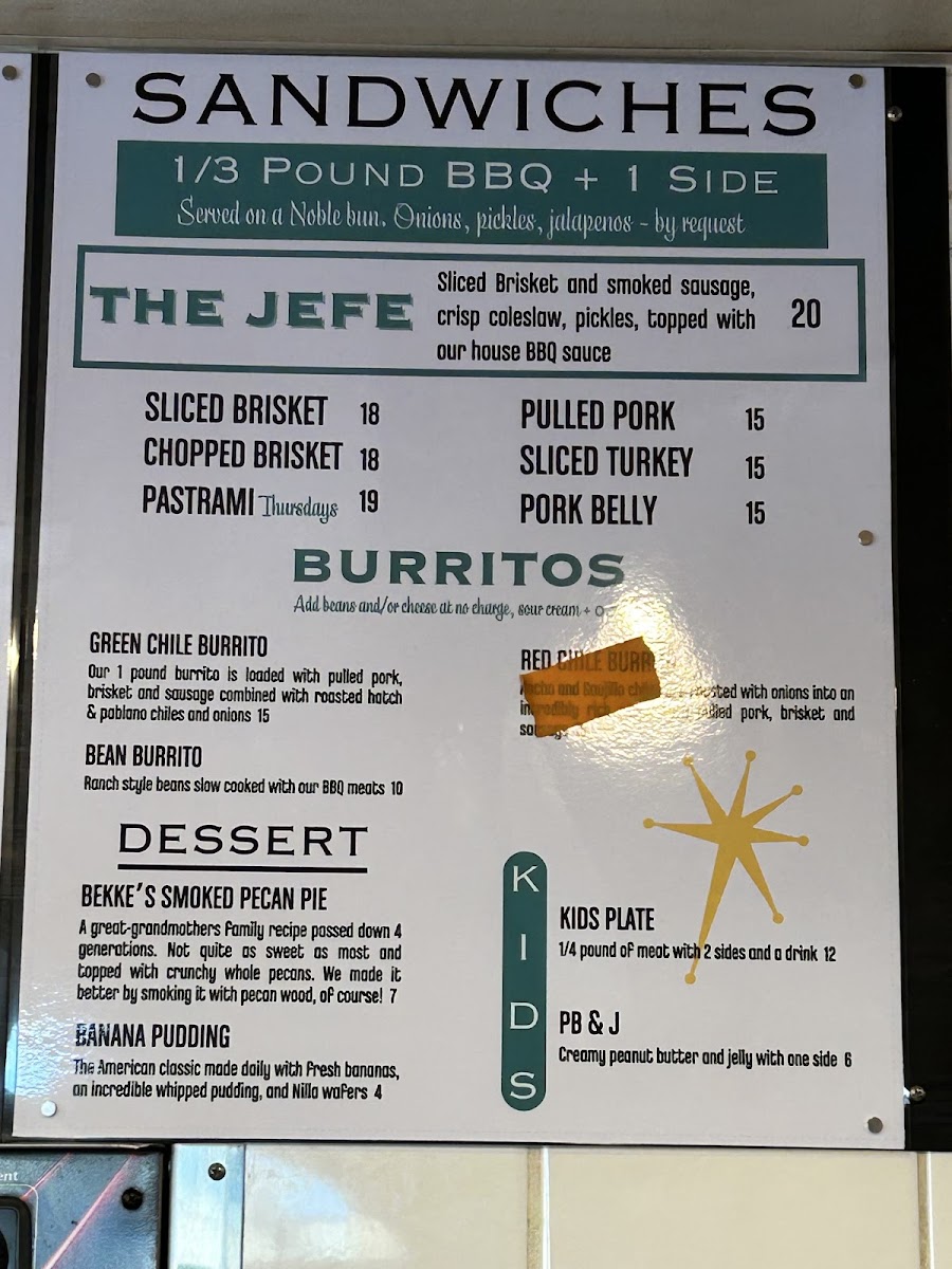 This green chile burrito is inspired by the amazing Sonoran food in Arizona's mining towns. Each burrito is 1 lb and absolutely delicious! All our of BBQ smoked meats are in the chile. Add on ranch-style beans (contains BBQ meat) and cheddar cheese at no charge.