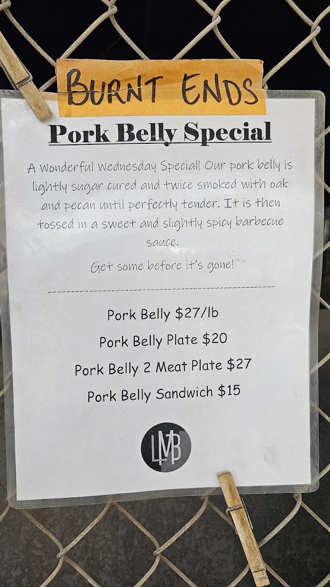 Our pork belly is lightly sugar cured and twice smoked with oak and pecan until perfectly tender. it is tossed in a sweet and slightly spicy barbecue sauce. Comes with your choice of 2 sides and BBQ sauce.